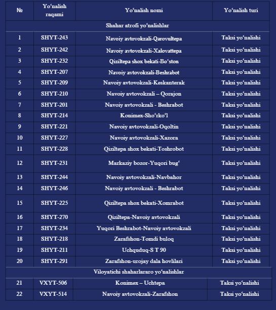 Navoiy viloyati bo‘yicha 22 ta yo‘nalishlar ochiq elektron tender tanloviga chiqarildi.