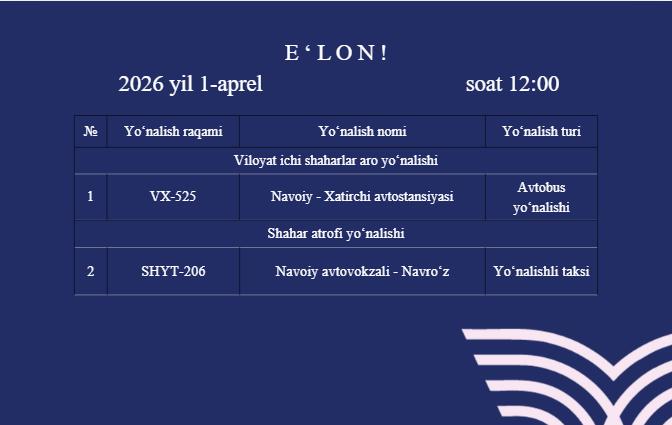 Navoiy viloyati bo‘yicha 2 ta yo‘nalishlar ochiq elektron tender tanloviga chiqarildi.