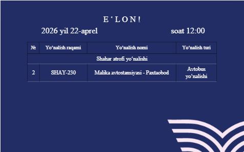 TASHUVCHILAR DIQQATIGA !