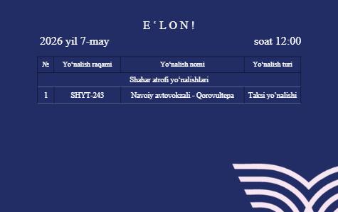 Navoiy viloyati bo‘yicha 1 ta yo‘nalish ochiq elektron tender tanloviga chiqarildi.