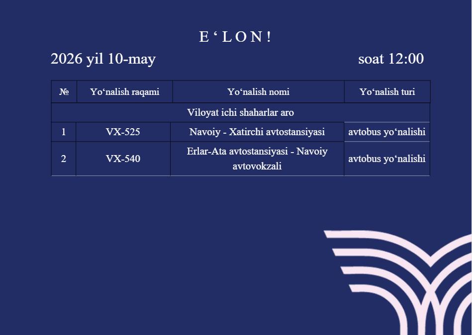 Navoiy viloyati bo‘yicha 2 ta yo‘nalish ochiq elektron tender tanloviga chiqarildi.