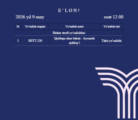 TASHUVCHILAR DIQQATIGA !