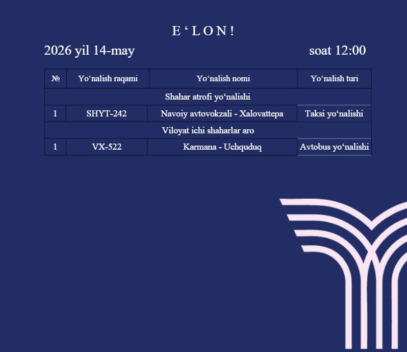 Navoiy viloyati bo‘yicha 2 ta yo‘nalish ochiq elektron tender tanloviga chiqarildi.