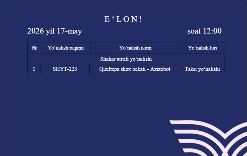 Navoiy viloyati bo‘yicha 1 ta yo‘nalish ochiq elektron tender tanloviga chiqarildi. T