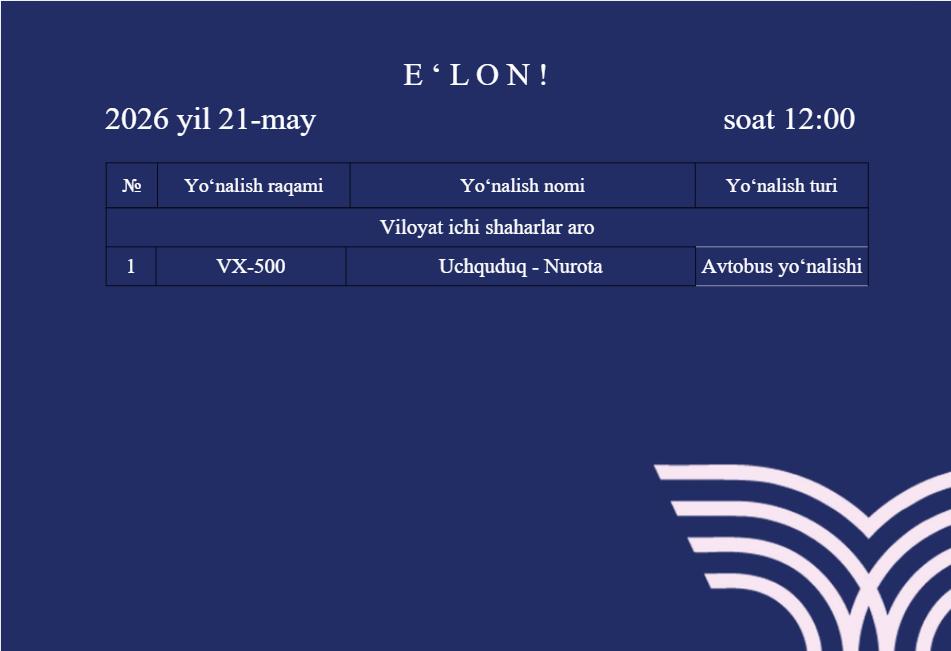 Navoiy viloyati bo‘yicha 1 ta yo‘nalish ochiq elektron tender tanloviga chiqarildi.