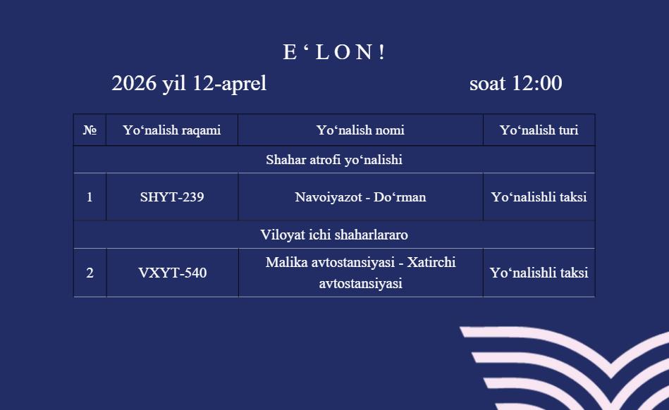 Two routes in the Navoi region have been announced for an open electronic tender.