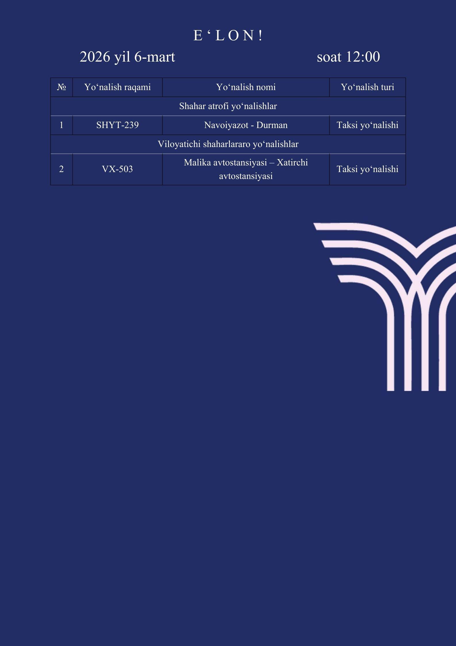 2 routes in Navoi region have been put out to tender for an open electronic tender.