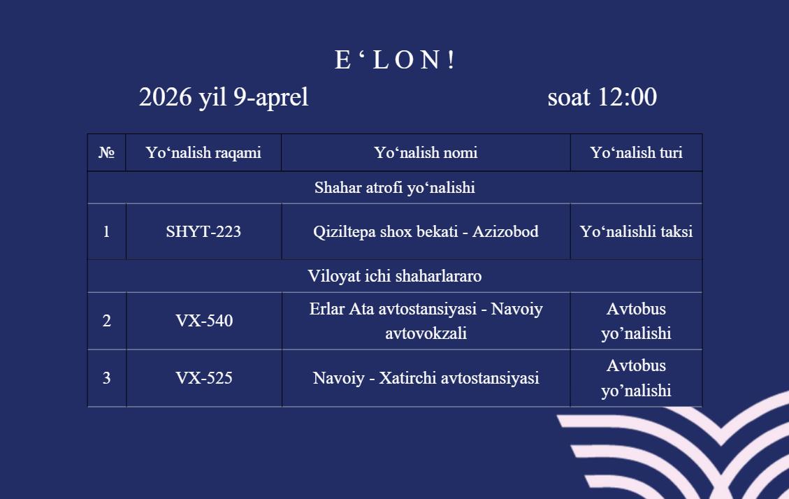 По Навоийской области на открытый электронный тендер выставлены 3 маршрута.