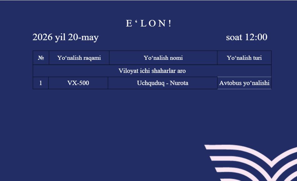 По Навоийской области на открытый электронный тендер выставлен 1 маршрут.