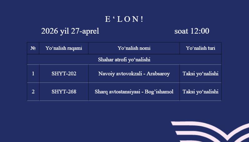 Навоий вилояти бўйича 2 та йўналиш очиқ электрон тендер танловига чиқарилди.