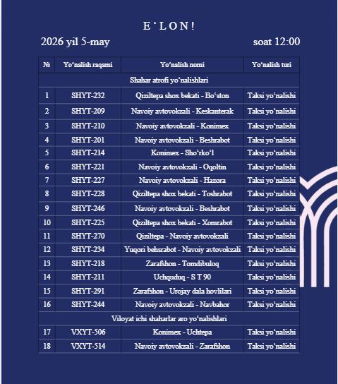 Навоий вилояти бўйича 18 та йўналиш очиқ электрон тендер танловига чиқарилди.